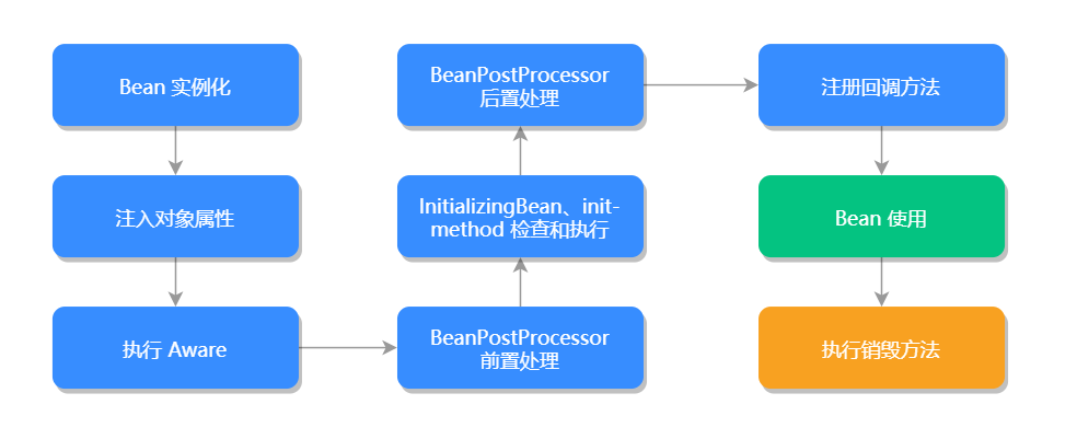 Bean 的三种注册方式:XML、Java 注解和 JavaAPI,以及 Bean 的五个作用域:singleton、prototype、request、session 和 application;还讲了读取多个配置文件可能会出现同名 Bean 的问题,以及通过源码讲了 Bean 执行的生命周期,它的生命周期如下图所示: