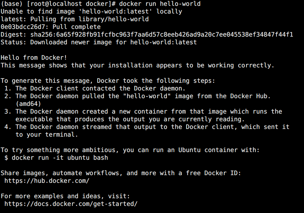 直接通过 docker run hello-world 命令,我们可以直接从阿里云拉取 hello-world 镜像并创建容器自动运行(在本地没有找到 hello-world 的镜像时)