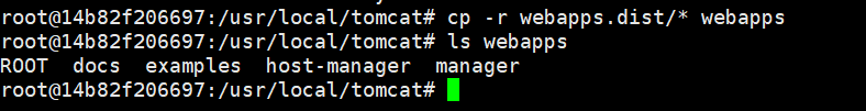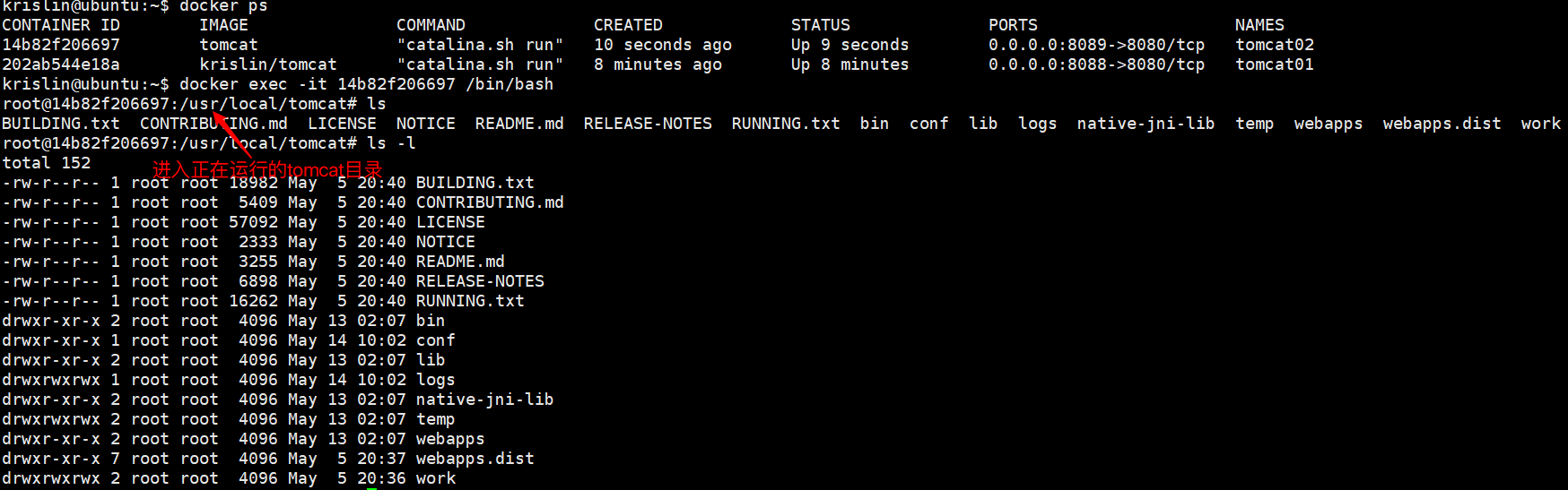 使用命令: docker exec -it 运行的tomcat容器ID /bin/bash 进入到tomcat的目录