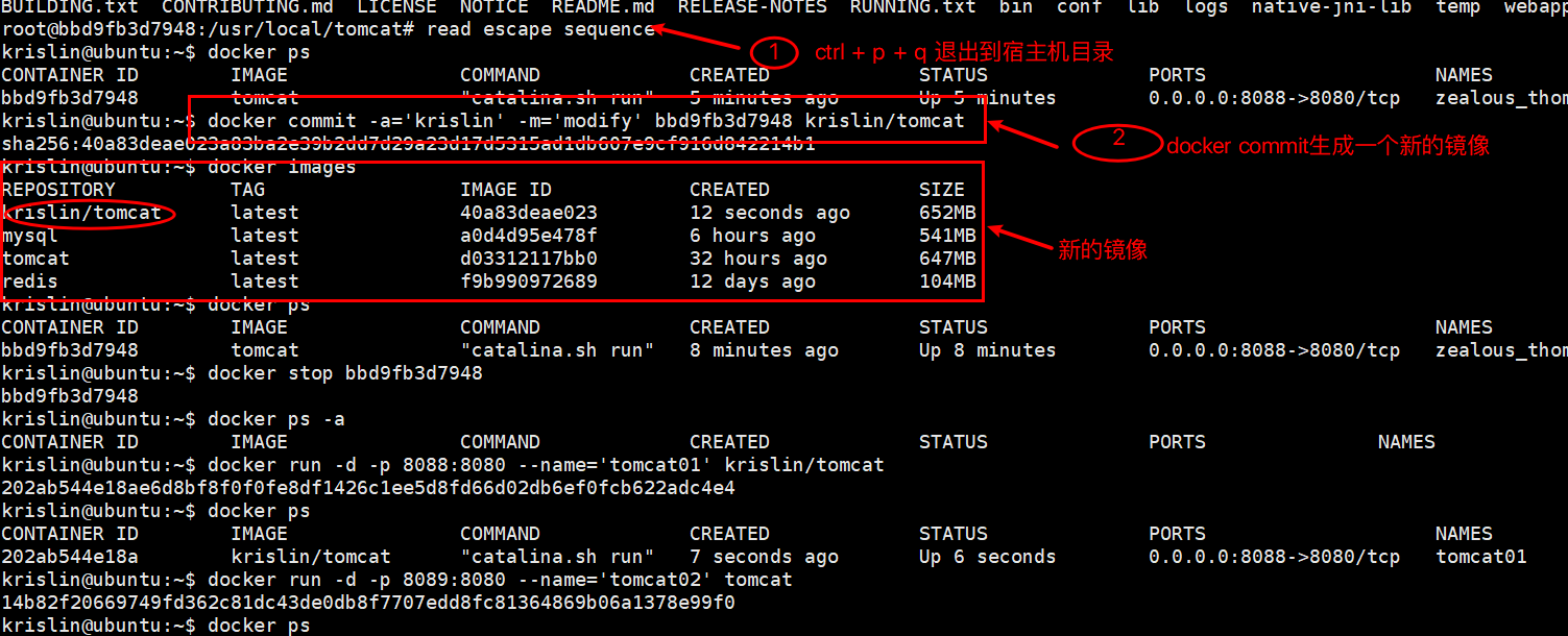 3.例子: docker commit -a='krislin' -m='将修改后的容器映射成新的镜像' tomcat krislin/tomcat