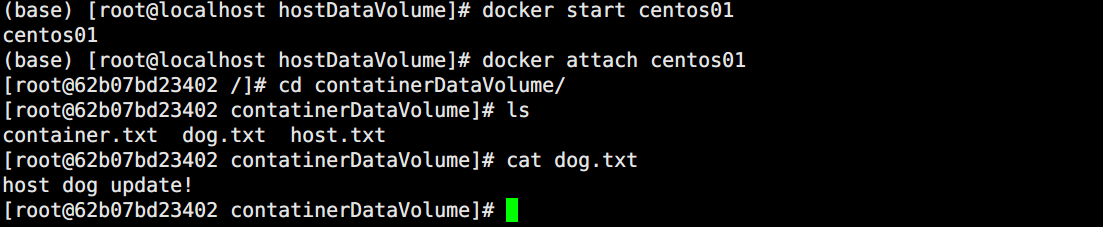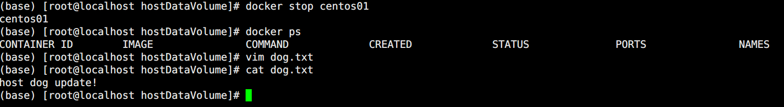 可以发现,即便是容器关闭,宿主机依然可以对数据卷进行数据操作,当容器重新开启时,数据卷会自动进行同步