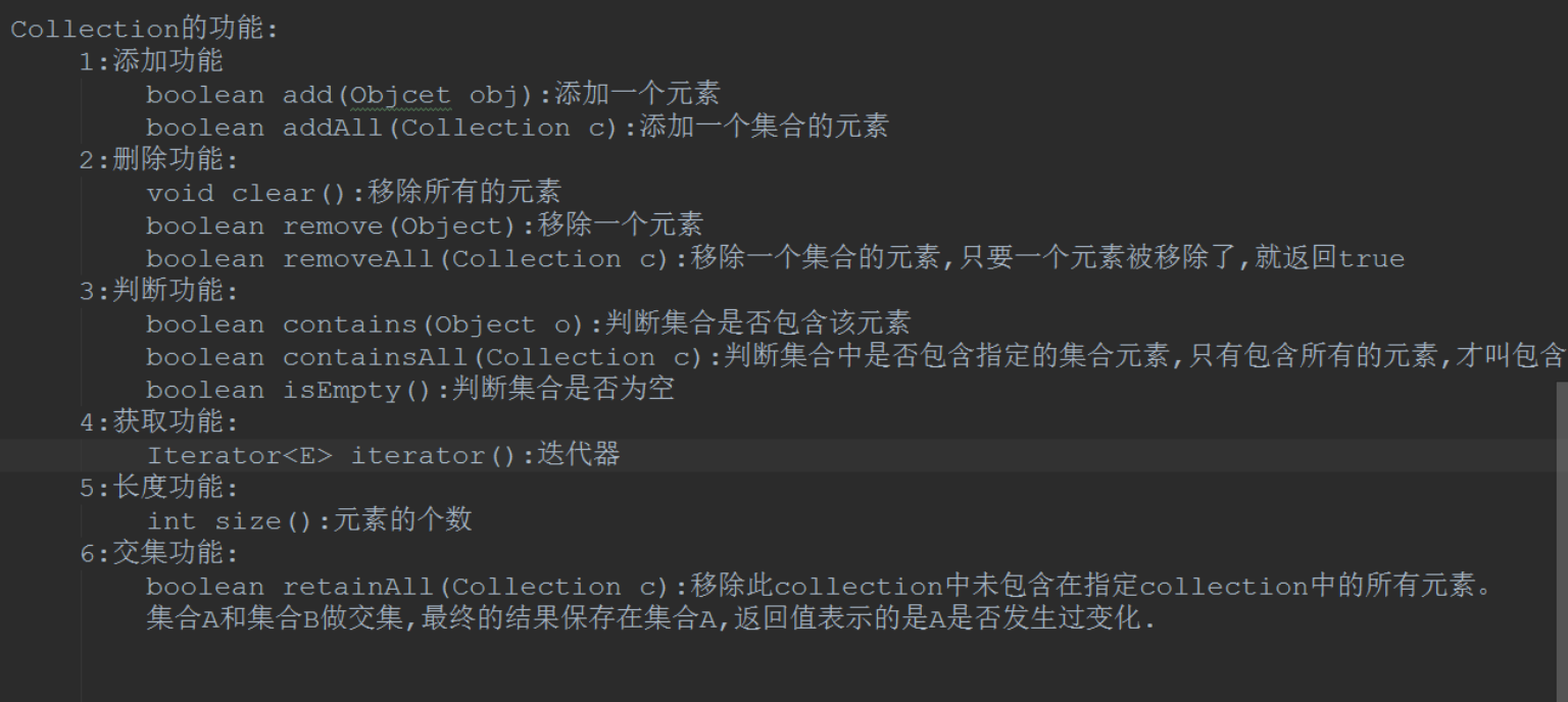 public boolean add(E e): 把给定的对象添加到当前集合中 。public void clear():清空集合中所有的元素。public boolean remove(E e): 把给定的对象在当前集合中删除。public boolean contains(E e): 判断当前集合中是否包含给定的对象。public boolean isEmpty(): 判断当前集合是否为空。public int size(): 返回集合中元素的个数。public Object[] toArray(): 把集合中的元素,存储到数组中。
