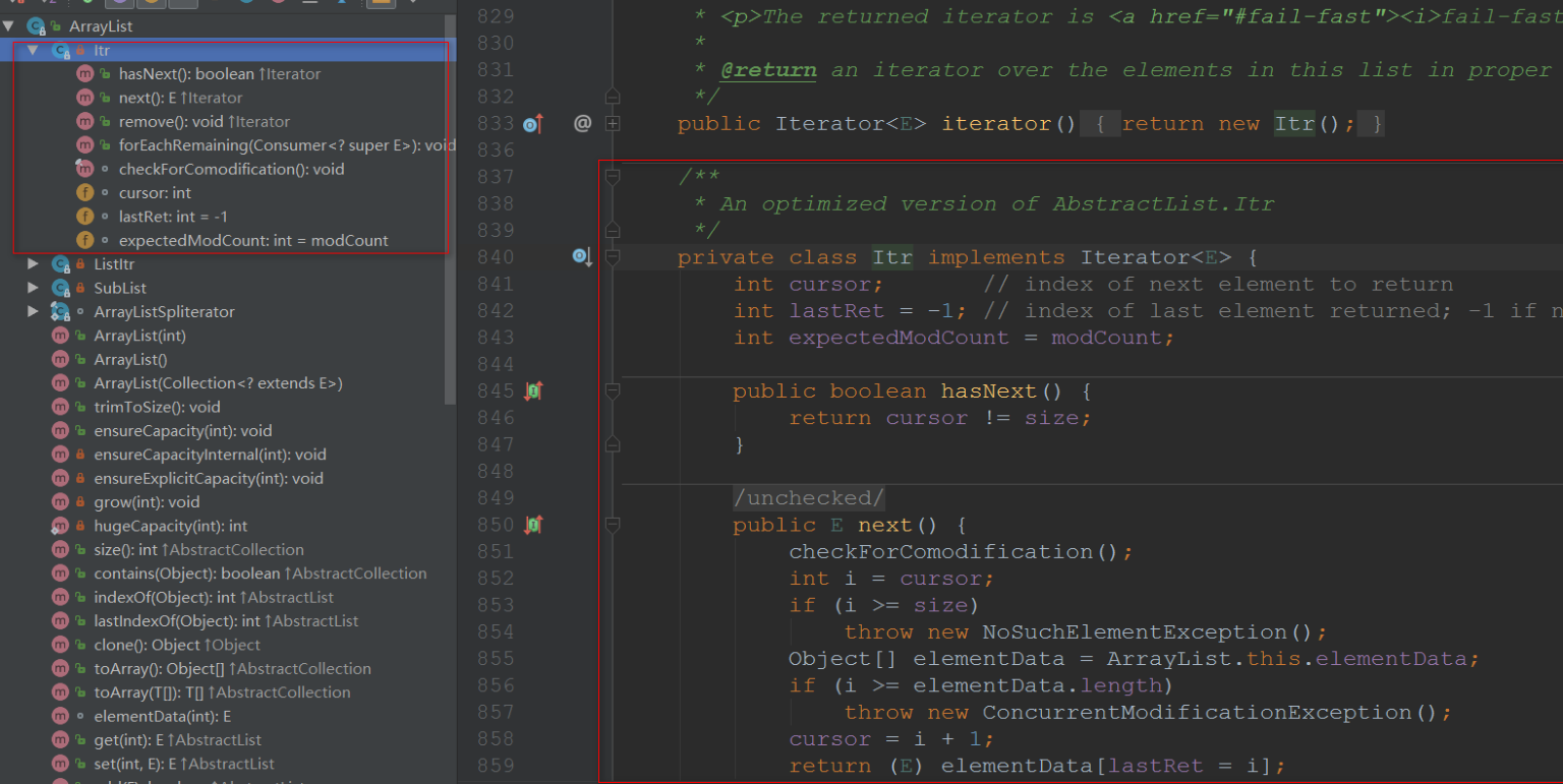 于是,我们在ArrayList下找到了iterator实现的身影:它是在ArrayList以内部类的方式实现的,并且从源码可知:Iterator实际上就是遍历集合