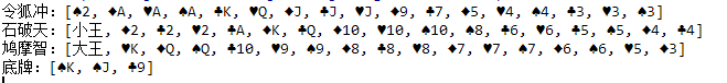 //4.查看三人各自手中的牌(按照牌的大小顺序)、底牌