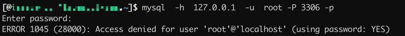 当输入正确密码之后可以连接到数据库了,如果密码输入错误,则会提示“Access denied for user 'xxx'@'xxx' (using password: YES)”密码错误信息,如下图所示: