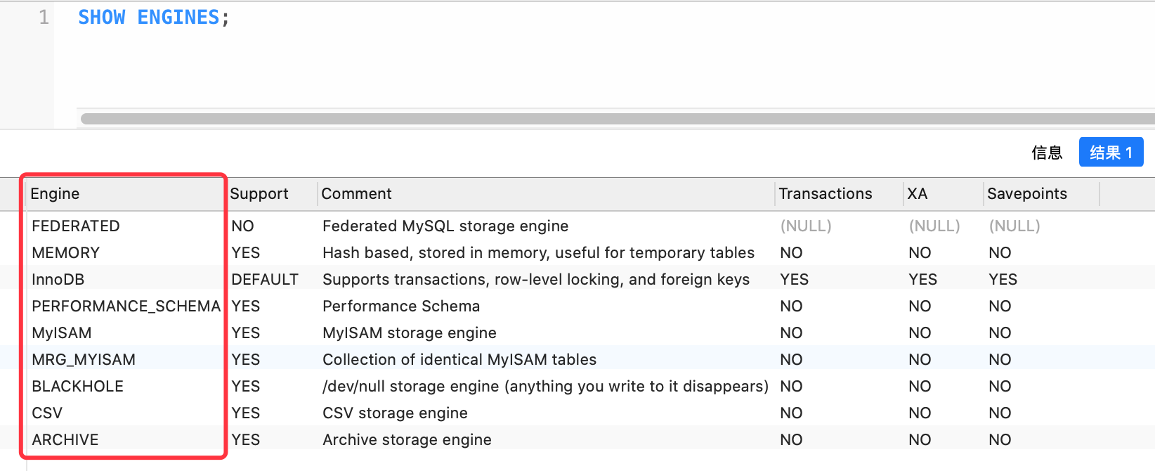 我们可以使用 SHOW ENGINES 命令来查看 MySQL 数据库使用的存储引擎,如下图所示: