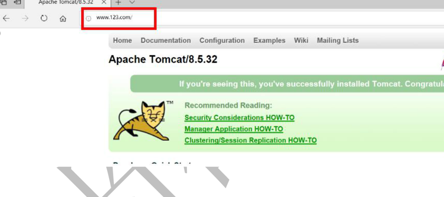 配置完成之后,我们便可以通过 www.123.com:8080 访问到第一步出现的 Tomcat 初始界面。那么如何只需要输入 www.123.com 便可以跳转到 Tomcat 初始界面呢?便用到 nginx 的反向代理。