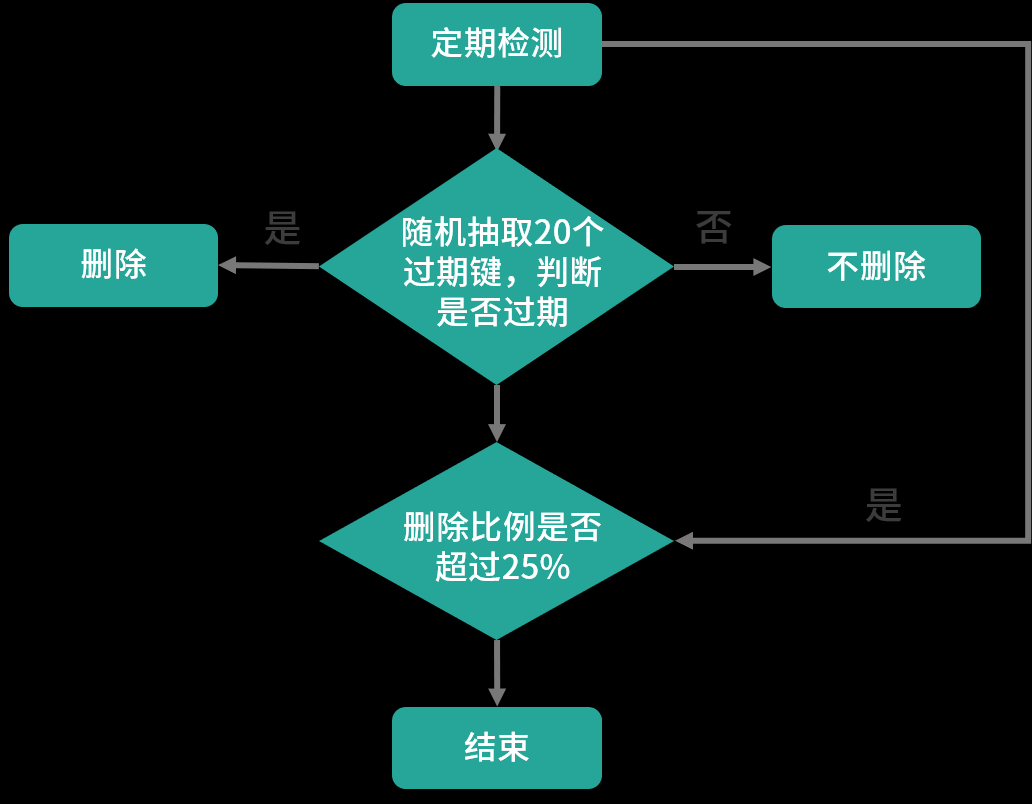小贴士:定期删除的扫描并不是遍历所有的键值对,这样的话比较费时且太消耗系统资源。Redis 服务器采用的是随机抽取形式,每次从过期字典中,取出 20 个键进行过期检测,过期字典中存储的是所有设置了过期时间的键值对。如果这批随机检查的数据中有 25% 的比例过期,那么会再抽取 20 个随机键值进行检测和删除,并且会循环执行这个流程,直到抽取的这批数据中过期键值小于 25%,此次检测才算完成。
