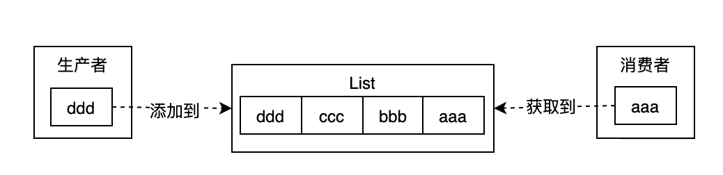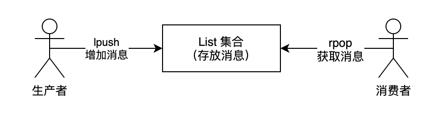 其中使用List 类型实现的方式最为简单和直接,它主要是通过 lpush、rpop 存入和读取实现消息队列的,如下图所示: