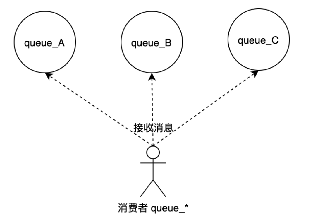 使用发布和订阅的类型,我们可以实现主题订阅的功能,也就是 Pattern Subscribe 的功能。因此我们可以使用一个消费者“queue*”来订阅所有以“queue”开头的消息队列,如下图所示: