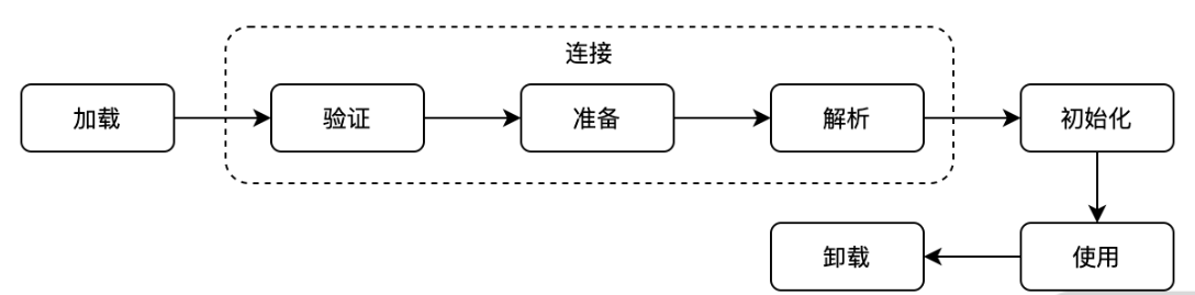 其中验证、准备、解析 3 个阶段统称为连接(Linking),如下图所示: