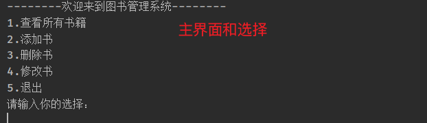 主界面的内容其实就是通过打印语句打印出来的.但是要注意因为每个操作过后都会重新回到主界面,所以使用while(true)死循环的方式.