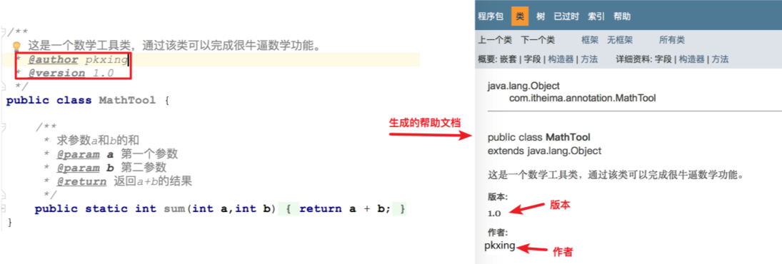 - 使用@author和@version注解就是告诉Javadoc工具在生成帮助文档时把作者姓名和版本号也标记在文档中。如下图: