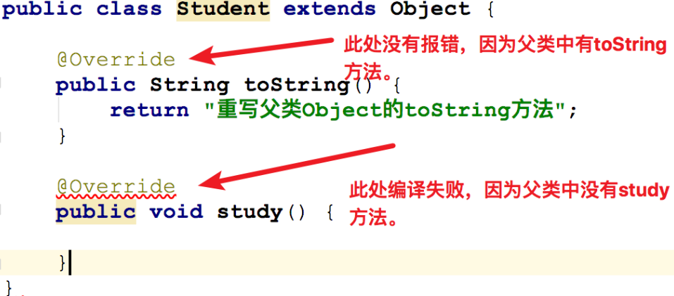 - 用来告诉编译器该方法是重写父类中的方法,如果父类不存在该方法,则编译失败。如下图